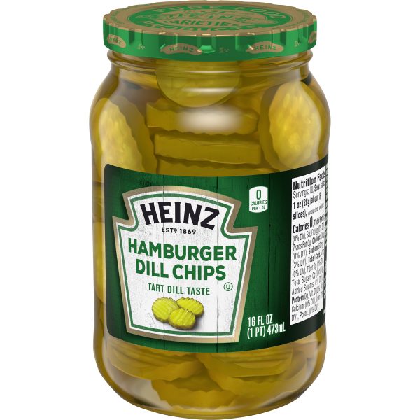 Heinz Hamburger Dill Pickle Chips are packed with tart dill taste and juicy, crunchy flavor. Stored in a brine made with white vinegar, these crunchy pickles are a delectable and easy snack or topping. With no fat and no cholesterol, this jar of pickles makes a wonderful treat for the whole family. Use sliced pickles as burger toppings or add them to your favorite deli sandwich. They’re also tasty by the handful whenever a craving for pickles hits. These dill pickles are packaged in a resealable 16 fluid ounce glass jar to lock in flavor in the fridge. From pickles to relish, Heinz creates common condiments done uncommonly well.