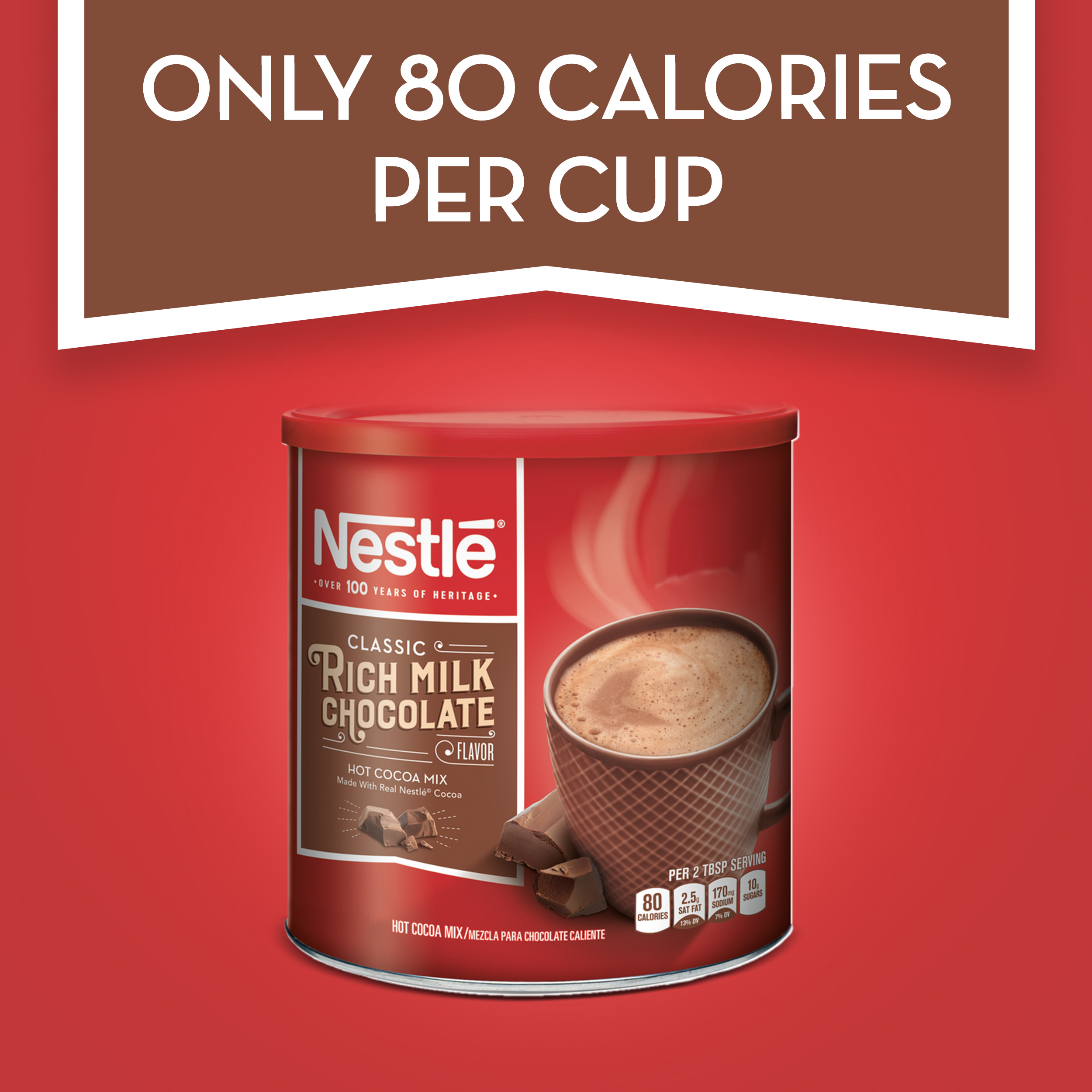 Bring a classic flavor to your home with the NESTLE Rich Milk Chocolate Hot Cocoa Mix 27.7 oz. Canister. It comes in a variety of sizes so you can enjoy just what you want. The Nestle hot cocoa mix is simple to prepare for your convenience. It comes in a large tub that allows for easy dispensing. The canister provides up to 30 percent of the recommended daily value of calcium in each tasty serving. It’s also gluten-free to accommodate special dietary needs. The chocolate is mostly caffeine-free too.